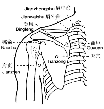 〖名解〗肩,穴所在部位为肩胛部也。外,肩脊外部也。俞,输也。该穴名意指胸内部的高温水湿之气由本穴外输小肠经。本穴位处肩胛上部,内部为胸腔,因本穴有地部孔隙与胸腔相通,胸腔内的高温水湿之气由本穴外输小肠经,故名肩外俞。