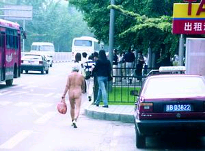 7月12日早晨8时许,北京前门东大街有一花白头发的妇女自东向西裸走,仅穿鞋袜,神态自如。这时,一辆警车从对面呼啸而来。她立即转身疾步往回走,在路口匆匆穿上衣服。