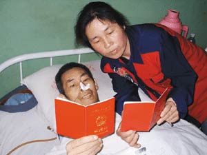 当日下午420分,当民政人员带着祝福,向刘学芳和莫洪福介绍了有关婚姻登记及办理程序后,这对患难夫妻表现出了人到中年情比金坚的感人一幕:刘学芳的左手拿着婚姻登记表格,右手搀起了丈夫,莫洪福用输液的右手,颤颤巍巍地在病榻上庄重地签下了自己的名字。