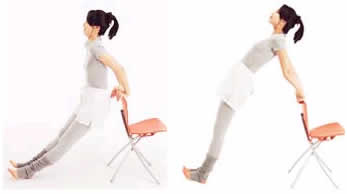 双臂放于身后,两手与肩宽,并抓住椅子靠背(或桌子)边缘,身体体重放在两肩。开始吸气,肘部弯曲,身体慢慢坐下。