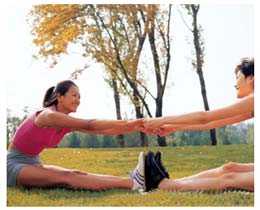 与同伴相向而坐,双腿尽量向身体两侧分开,上身微微前屈,握住彼此的双手或手腕;脚掌与同伴脚踝部位相抵;上身向后仰,双臂弯曲,将同伴向自己身体方向拉,令其双臂伸直,身体前屈,甚至臀部可微微提起。保持伸展姿势并深呼吸3次。变换双方位置,重复动作10次。