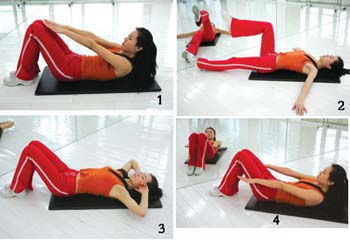 动作二:两臂打开,上身保持稳定,背部贴在地板上,然后抬小腿与大腿成90度,两腿交替进行。要争取用腹横肌来抬腿。做10~15次。