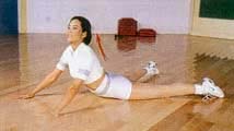 仰卧抬臀 仰卧床上,屈膝,两膝并拢,两脚分开略比臀宽,两臂伸直(掌心向下)置于体侧。两腿分开,身体重心移到肩部,以肩支撑,吸气抬臀,稍停。呼气,慢慢将臀部放下,还原。重复练习20次以上。