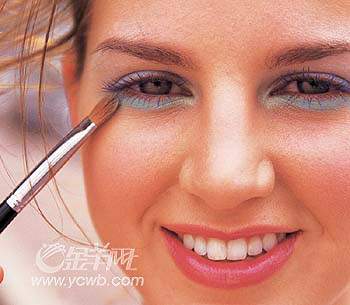 先以珍珠白色扫在眼部四周作打底,再扫上深浅不同的蓝色眼影营造层次感,然后以青绿眼影扫上较粗的下眼线。