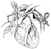 劈开并撑开胸骨后,在切开心包和注射肝素之前,即用电刀沿胸廓内动脉两侧距血管约1cm处切开胸内筋膜,从第6肋间起向上到胸骨上方,游离胸廓内动脉、静脉以及周围脂肪组织和肌肉、胸膜。肋间动脉分支需结扎切断。游离的胸廓内动脉及其周围组织则需小心保护,免受创伤,并包绕以浸有稀浓度罂粟碱溶液的纱布。开始体外循环前全身肝素化后,在第6肋间水平结扎切断胸廓内动脉,近侧动脉切端出血量每分钟可达120~240ml,如每分钟出血量少于100ml,则血管质量欠佳,不宜应用。切开左前降支,选择适当长度处剥除胸廓内动脉远段周围组织,显露长度1cm左右的动脉,管腔可用直径1.0至1.5mm的扩张器轻柔地扩大后斜向切断,用7~0Prolene缝线与前降支切口作连续或间断缝合,然后用数针间断缝线将胸廓内动脉周围软组织与心肌缝合固定,以减少吻合口张力,横向切开左侧心包,以保证胸廓内动脉进入心脏的途径畅通无阻(图2)。