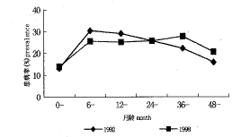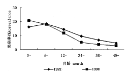 随着国家经济的发展,儿童营养的改善以及人们卫生保健知识水平的提高,尤其是农村饮水条件的改善,儿童腹泻患病大大降低。1998年城市儿童腹泻患病率在各个年龄段都低于1992年,下降最多是在24个月龄以内,平均下降3.3个百分点。农村儿童主要在12~48个月龄之间,平均下降3.4个百分点。但我国贫困农村,6岁以下儿童腹泻患病率仍很高,如宁夏中卫县6岁以下儿童腹泻患病率为10.8%,云南广南县16.1%,四川南部15.6%,广西靖西18.9%。