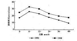 图6 1992年与1998年城市5岁以下儿童腹泻患病率