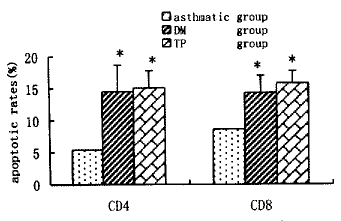 图1 DM和TP对哮喘豚鼠CD4、CD8细胞凋亡的影响*:P<0.01与哮喘组比较Fig1 The effects of DM and TP on apoptosis of CD4,CD8 cells*:P<0.01 vs asthmatic group
