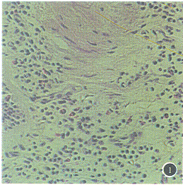 不同点:哮喘组患者支气管粘膜基底膜明显增厚于慢支组患者(P<0.05),其平滑肌增厚亦较慢支组明显,粘膜下层细胞浸润以EOS、肥大细胞(MC)为主(图1),与慢支组比较差异有显著性(P<0.01,表3),慢支组气道粘膜糜烂、水肿、粘膜下淋巴细胞、巨噬细胞、嗜中性粒细胞等炎性细胞浸润与哮喘组比较,差异无显著性(P>0.05),但其中嗜中性粒细胞增多较哮喘组显著,粘膜水肿、纤维化程度较哮喘组严重(图2)。