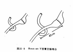 2.Roux-en-Y手术 原为BillrothⅡ式手术者,将吻合口处输入段切断,近侧切端吻合至输出袢(见图25-9)