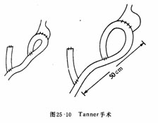 4.Tanner手术 适用于原为BillrothⅡ式手术者,切断空肠输入袢,远侧切端与空肠输出袢吻合成一环状袢,近侧切端吻合至距原胃空肠吻合口50cm的空肠上(见图25-10)。