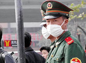 广州火车站维持治安的武警也戴上口罩以策安全。(中新社照片)