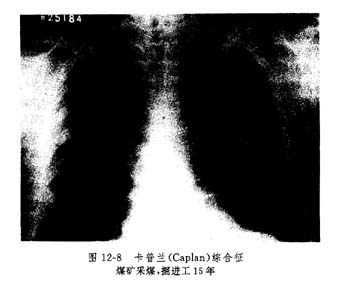 在煤矿工人中有时可见Caplan综合征,表现为肺内有胶原纤维和粉尘组成的巨大结节,中心为坏死组织,周围有炎性细胞和巨噬细胞浸润。可在肺内只有少量粉尘时发生,是矿尘和类风湿因子反应的结果。