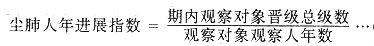 以前常用“晋级率”(每百名尘肺向上进展一级的比率)、“平均晋级年限”(晋级的尘肺病例平均经过的年限)作为尘肺进展指标。笔者发现这两个指标在实际操作中存在一些问题:一是对越级晋升的病人(如直接从0+晋升为Ⅱ+)到底怎么处理,国内尚无统一规定;二是“平均晋级年限”不能客观反映晋级年限的实际情况。如某矽肺患者,在确诊为Ⅰ期矽肺2年后自觉症状加重,如及时检查有可能已晋升为Ⅱ期,但企业拖到5年后才检查,该患者的晋级时间人为地由2年变成了5年;三是一般应该晋级率越高,平均晋级年限越短,反之亦然,但在实际工作中有时可碰到与此相反的情况,使人困惑。基于上述情况,笔者认为可以用“尘肺人年进展指数”作为反映尘肺进展情况的指标。该指标是将英国的“尘肺进展指数”[1]改良后得来的。