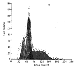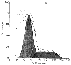 2.4 流式细胞术检测出现凋亡峰 二株胃癌细胞在As2O3 作用后,经PI染色DN A 流式细胞术检测,发现在G1期细胞峰前,出现亚二倍体凋亡峰,且随着As2O3浓度 的升高和作用时间的延长,细胞凋亡的百分数增加,细胞的凋亡量与S期的细胞数有关,As 2O3可诱导细胞进入S期,并促进其凋亡。图2为两株胃癌细胞经1.0 μmol/L As2O3作用5d后的流式细胞术检测结果。