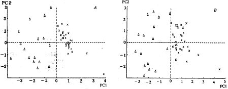 1 47个样本在前两个主成分上得分分布 (A)5个变量 (B)8个变量