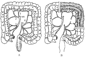 A.结肠血运:1.回结肠动脉;2.右结肠动脉;3.结肠中动脉;4.左结肠动脉;sm.肠系膜上动脉;im.肠系膜下动脉;B.切断左结肠动脉,保留结肠中动脉,利用部分横及降结肠,逆蠕动移植;C.切断结肠中动脉,保留结肠左动脉,利用横结肠顺蠕动移植;D.切断回结肠动脉,保留结肠中动脉,利用升结肠及部分横结肠顺蠕动移植