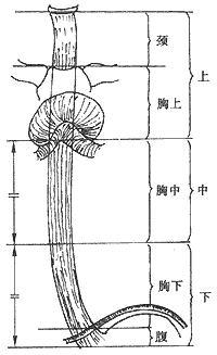 食管的分段法:从1940年吴英恺在我国首次成功切除你内食管癌开始,即采用了下述分段法:上段自食管入口(相当于颈椎第6水平)到主动脉弓上缘,又再分为自食管入口到胸骨切迹的颈段和自胸骨切迹到主动脉弓上缘(T4上缘)的胸上段;中段自弓上缘起到下肺静脉下缘(T6下缘)止,下段从下肺静脉下缘到贲门(包括膈下腹段食管)。此分段法缺点:①主动脉弓作为标记不是恒定的,它随年龄增长而屈曲延长上移;②胸下段偏短,胸中段偏长,分割不均等;③下肺静脉有时显示不清,不易辨认以及中段包括了气管分叉上下两部分所谓高位中段和低位中段,但两者的切除率和预后是差别很大的。中国沿用的食管解剖分段见图2。