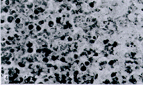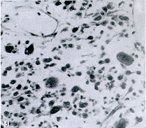 肉眼观察:对照组肿瘤表面可见点状瘀血区,未见包膜,切面呈灰红色鱼肉状,质硬。实验组肿瘤表面可见大片瘀血区,切面可见中央坏死区,其周围见少部份呈灰红色鱼肉状,质较软(见图2)。显微镜下观察:对照组可见癌细胞生长活跃,细胞密集,间质少,呈片状分布,癌细胞呈圆形,细胞边界清楚,核大,染色深,核结构清晰,核分裂象多见。实验组在曝磁后24小时切片上可见:癌细胞边界不清,胞浆出现空泡性改变,出现癌细胞坏死(见图3、4)。曝磁