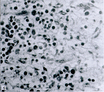 另外,实验组:可见间质内大量淋巴细胞浸润,呈大片状,尤以坏死的边缘为甚,吞噬细胞数量也较多。而对照组:淋巴细胞数量较少,呈散在局灶性,吞噬细胞数量较少(见图5、6)。实验组和对照组在接种肿瘤后7~22天不同时间点取出的心、肝、肺、脾、肾等器官切片观察均未见有任何病理改变。