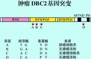 该基因命名为DBC2 (deleted in breast cancer)属于一种抑癌基因,其正常功能是预防与肿瘤发生相关的异常细胞增殖。该基因及其生物学功能以前从未报道过。DBC2基因的重要性表现在于它是目前和90%的散发的,即非家族性的乳腺癌相关的少数基因之一。