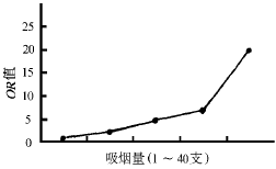按每日吸烟支数分5组(1~4,5~9,10~19,20~39,40~),计算OR值,得剂量效 应关系如图1。