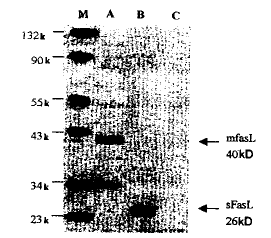 (M:Size Marker;Lane A:MCF-7细胞裂解液,见mFasL阳性;Lane