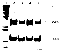 10 μl的cDNA合成产物不需纯化,直接进行PCR,总反应体积100 μl内含250 μmol/L dNTP,50 μmol/L设计引物,1.7 mmol/L MgCl2,67 mmol/L tris-HCl(pH8.8),1.25 U Taq DNA 聚合酶,50 μl矿物油,反应条件94℃50 s,60℃50 s,72℃50 s,共35个循环后72℃延伸10 min。cNOS PCR 除进行37个循环和引物不同外其余条件相同。取10 μl PCR产物在2%琼脂糖和7%聚丙稀酰胺凝胶电泳上鉴定。A549和U937分别作为iNOS和cNOS mRNA的阳性对照。