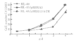 2.2 端粒酶反义RNA对HL-60细胞生长的影响 HL-60细胞的倍增时间为24~36 h,4 d以内呈对数生长,5 d以后死亡细胞逐渐增多,活细胞数下降.而HL-60/pBBS212-hTR细胞培养后48 h即可出现端粒酶反义RNA对其明显的持续的 抑制作用,与HL-60/pBBS212,HL-60细胞相比有显著差异(P<0.05).细胞倍增时 间延长至60~72 h(Fig 2).