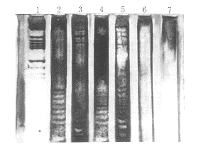 2.3 端粒酶反义RNA对HL-60细胞的促凋亡作用 ①形态学观察:光镜下观察HL-60/pBBS212-hTR细胞大部分形态正常与亲本HL-60细胞形态上无显著差别,但细胞生长缓慢,有一 些死细胞漂浮并可见有的细胞体积缩小,染色质浓缩,密度增高呈粗颗粒状浓集于核膜周围,胞质出现颗粒样物质,空载体pBBS212转染的HL-60 细胞(pBBS212/HL-60)与亲本HL-60细 胞形态上无显著差别. 电镜下观察HL-60/pBBS212-hTR细胞可见轮廓清楚,质地致密的染色质团块并边集,细胞骨架崩解,形成膜包裹的致密的凋亡小体.②流式细胞仪检测结果:检测 出 HL-60/ pBBS212-hTR细胞在G1期前有一亚二倍体的凋亡峰,凋亡细胞占全部检测细胞的15.8% ,G1 期细胞数明显高于对照组,且S期细胞数明显减少.而对照组未出现凋亡峰. ③DNA片段分析结果:紫外灯下观察,HL-60/pBBS212-hTR细胞DNA出现典型的梯状电泳条带.而对照组未出现典型的梯状电泳条带(Fig 3).