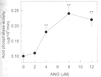 图3ANO(2~8μmol/L)作用96小时对HL-60细胞酸性磷酸酶活性的影响n=3,X±s**与对照比较P<0.01