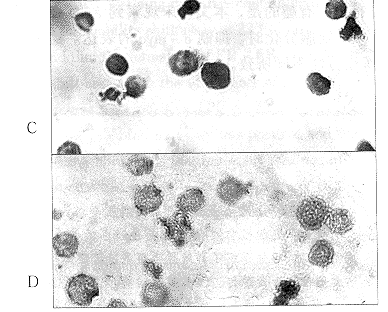 未经药物处理的HL-60细胞呈圆形或椭圆形,胞核大而圆,核浆比例较大,经ANO2μmol/L(<IC10)处理后,核浆比例减小,核仁减少或消失,胞核呈肾形或有较大切迹(图2),提示细胞向成熟表型分化。同样条件下,ATRA1μmol/L(<IC10)处理4天,也能够诱导HL-60细胞分化(图2)。