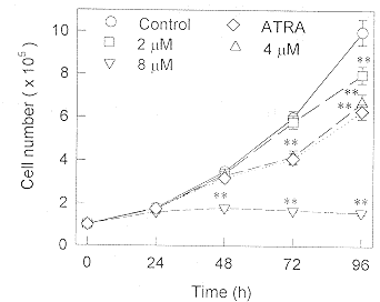 在体外模型上,能够诱导肿瘤细胞终末分化的药物很多,如维甲酸类化合物,1,25-二羟维生素D3,干扰素,佛波酯,平面极性化合物,细胞毒药物,环AMP调节剂及类似物等[1,2],但真正能够应用于临床并产生良好疗效的,目前只有全反式维甲酸(ATRA)。ATRA也有局限性,如只对急性早幼粒细胞白血病有效,对其它肿瘤无效;长期应用,容易产生抗药性等,因此,寻找新的分化诱导剂仍有十分重要的意义。