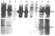 条带上数字为病例号,其后有A者代表阿霉素组,无A者代表对照组,F代表Fadu细胞株(阳性对照),H代表HL-60细胞株(阴性对照),M为标记的分子量(图2~4均相同表示)。可见第3、4例与Fadu类似,对照组及阿霉素组p53均为强表达而p21无表达或表达很低且两组间无差别,提示p53功能异常。HL-60对照组与阿霉素组p53及p21均无表达。