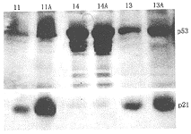 图2 第11、13两例对照组p53为低表达,诱导后p53及p21均明显增加,说明p53功能正常。第14例对照组及阿霉素组p53均为极强表达而p21无表达,提示p53功能异常。