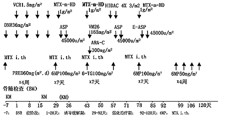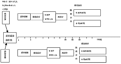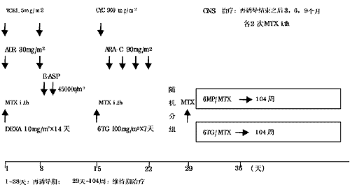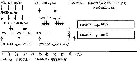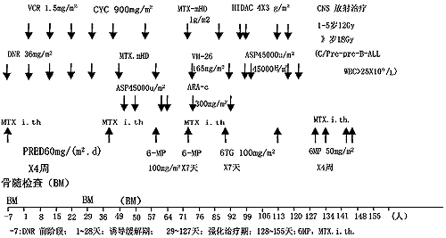 COALL-92方案分为下列6个阶段:柔红霉素治疗的前阶段,“治疗窗口”,诱导治疗,强化阶段,避护所治疗和再强化治疗。并将病人再次随机临床分组,分别采用6-MP+MTX或者6-TG+MTX的长期维持治疗。整个疗程共2年(图1~5)。