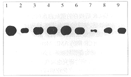 图4 CR期M2bRT-PCR扩增产物与探针C6E6H2杂交结果。1、8、9分别为例1、6、19,2~5为例34,CR后0、2、3、4个月,6、7为例12,CR后1、2个月时3 讨论