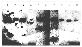 1.3.2 Southern Blot:1)标记探针:所用探针包括AML1cDNA(外显子5,6)探针C6E6H(由日本琦玉肿瘤研究中心Miyozhi博士惠赠)、AML1基因组(内含子5)探针和MTG8基因组探针probe8(分别由Himnerznuth医院的Tighe和Calabi博士惠赠)。上述探针按随机引物法用α-p32-dCTP标记,用Sephadex-50层析纯化,标记探针的比活性大于1×109min-1.ug-1DNA。2)转膜杂交:取10μg基因组DNA,经EcoRⅠ及(或)BamHⅠ完全酶切,进行0.6%琼脂糖电泳,转移至硝酸纤维素膜上,然后固定、预杂交、杂交、洗膜、放射自显影。