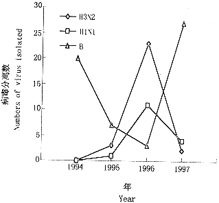 2.1 1994~1997年流感病毒在深圳地区活动特点 从图1可看出,当前深圳地区人群中仍同时流行甲3(H3N2),甲1(H1N1)亚型和乙型流感病毒,它们相互间有相克现象即当甲型流感病毒活动减弱时,乙型毒株活动加强,如1994和1997年。反之,当甲型毒株活动加强时,乙型毒株活动就减弱,如1996年。但不是每年都这样,它们有共同低潮时期,如1995年。