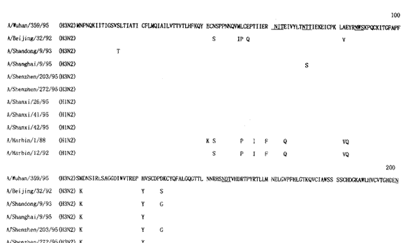 同时,图1还表明三株H1N2病毒HA1区氨基酸序列与当时人群中流行的甲1(H1N1)A/北京/262/95及以往发现的H1N2亚型毒株A/哈防/1/88的同源性仅分别为83.4%和84.0%。