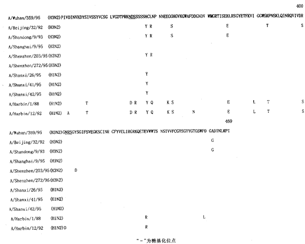 Note:The amino acid sequences of the HA1 protein molecule of all the comparing viruses compared were provided by the National Influenza Center of China. “-”means the essential glycosylation site