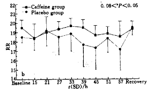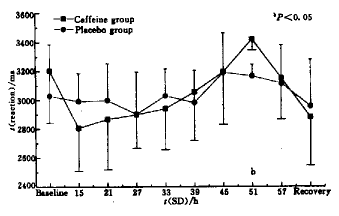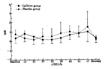 从Fig 1可见咖啡因组和安慰剂组仅在基础值之间表现出统计学差异,与SD15 h和recovery综合分析则表明这一差别只能反映出安慰剂组的练习效果较差,到SD15 h时已经没有实际意义.咖啡因组的图形基本呈水平线,正确反应在整个SD期间基本维持在基础水平;而安慰剂组则有一定的波动,并且出现两个低谷.这表明SD可以减少正确反应,而咖啡因可以对抗SD的这一作用,但没有统计学意义.