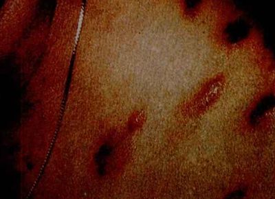 图注:左侧胸部有大小不等的深紫红色结节性病损,大部分病损中心有出血斑。该图为典型的Kaposis肉瘤皮肤损害。