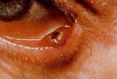 图注:下眼睑缘有一结节,在结节上有出血斑。该病损在非洲Kaposis肉瘤中为常见型。