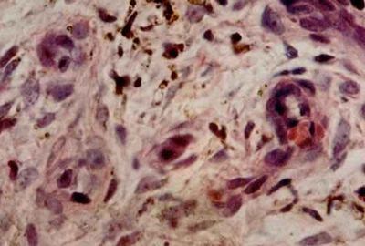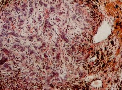 图注:aposis肉瘤 皮肤活组织检查 石蜡切片H-E染色 光镜(4×10)(10×10)(10×40)可见肿瘤组织中有许多新形成的血管,血管扩张,内皮细胞肿大突出于管腔内,红细胞外溢,含铁血黄素沉积。肿瘤由成纤维细胞、上皮样细胞淋巴细胞组成,并有大小不等、染色较深的圆形、椭圆形细胞。