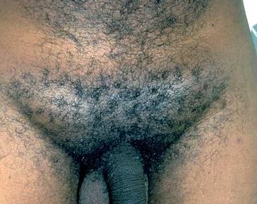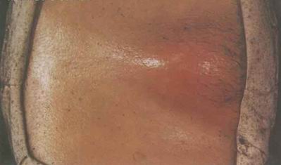 图 注:腹股沟部有明显肿大的淋巴结,皮肤潮红,肿胀,病损中心有化脓趋势,压痛阳性。