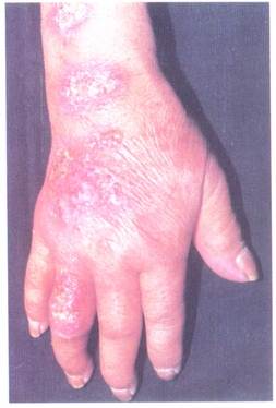 相关图片: 孢子丝菌病(固定型) 孢子丝菌病(淋巴管型) 孢子丝菌病是由申克氏孢子丝菌所引起。本病损害多见于皮肤,极少数见于粘膜、骨骼、肌 肉、中枢神经系统、肺、肝、脾、眼等脏器。发生在皮肤的病主类型可分为固定型、淋巴管型及播散型。淋巴管型损害大部分发生于暴露部位,单侧上肢或下肢,尤以右手多见。大多先有外伤史。潜伏期为5天到6个月,平均为3周,初发为圆形、质硬无痛的皮下结节,以后结节隆起,粘着皮肤,表面淡红到紫红,逐渐软化、溃破,形成溃疡,表面有稀薄分泌物,溃疡边缘常呈紫黑色,谓之孢子丝病下疳,亦称初疮。1-3周后,继发必损害从初疮部位沿淋巴管向心性出现,数目数个到数10个,排列成串,但损害很少超过腋窝或腹股沟淋巴管。 |