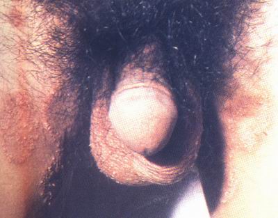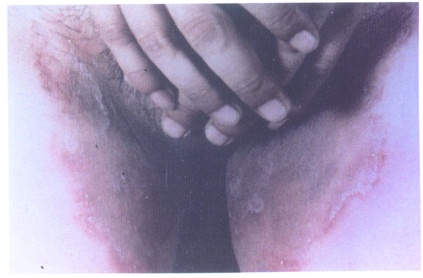 股癣为体癣发生在外生殖器,肛门及股部的特殊型。可为单侧或对称分布,基本损害同体癣,但由于该部位多汗潮湿易受摩擦,故皮损炎症显著,瘙痒较重,发展也比较迅速。损害多为环形向周围扩展,边界清楚。