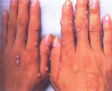 疣是由人类乳头状病毒引起的表皮良性赘生物。寻常疣祖国医学称千日疮,俗称刺瘊。由天疣生长形态不同而有特殊类型,有丝状疣和指状疣。后者如图,为在软基础上发生参差不齐的多个指状突起,数目多少不等。
