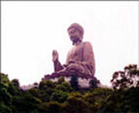 在香港岛以西的海面浮立着地域宽阔、风光秀丽的大屿山。岛上座落着雄伟壮观的宝莲寺,而天坛大佛就矗立在寺旁海拔482米的木鱼峰上。天坛大佛是九十年代初建成的一座大铜佛。大佛身高26.4米,底座高7.55米,总高度接近34米,占地面积约6567平方米,重量高达250吨。它是世界上最高最大的露天释迦牟尼青铜像。因其基座是仿照北京天坛而设计,故习称"天坛大佛"。